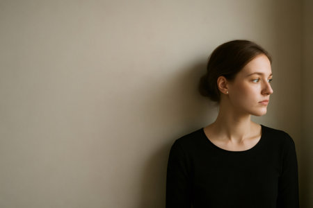A serene portrait of a young woman with a natural look, showcasing her beauty against a neutral wall. The soft lighting enhances her relaxed expression.