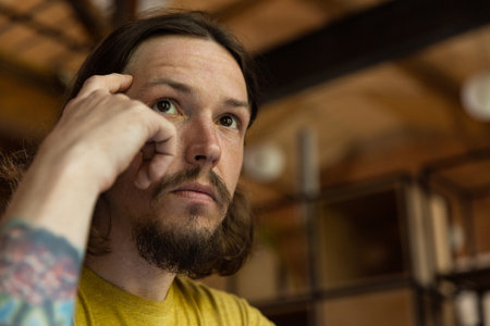 stressed and bearded man looking away while thinking at home