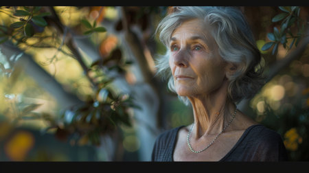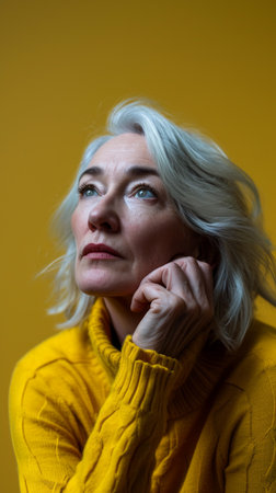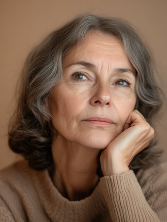 An older woman with gray hair looks pensive, resting her chin on her hand. She appears calm and reflective in a softly lit, warm-toned room.