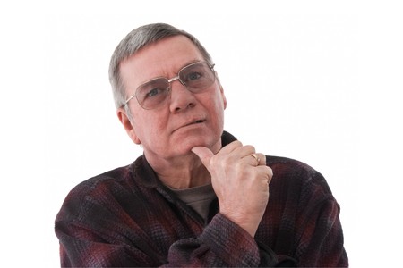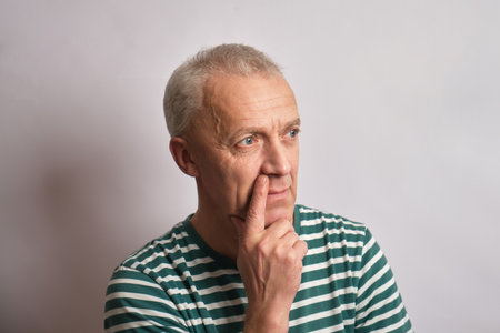 Portrait of 57 year old senior man wearing a dark flannel shirt, deep in thought, isolated on white background.