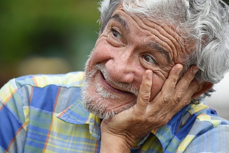 Wrinkles on an older man's forehead, with his hand resting thoughtfully on his chin.