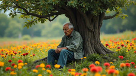 Man sits under a tree in a field of flowers. The scene is peaceful and serene, with the man looking out into the distance
