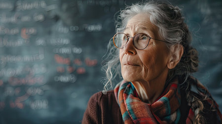 Elderly Woman with Glasses and Scarf in Front of Blackboard