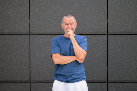 Senior man in a blue t-shirt standing in front of a modern black wall with his arms crossed and a thoughtful facial expression.