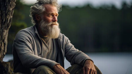 A mature man with a gray beard sits calmly in a sunlit meadow, gazing into the distance. This peaceful, contemplative scene evokes solitude and connection with nature.