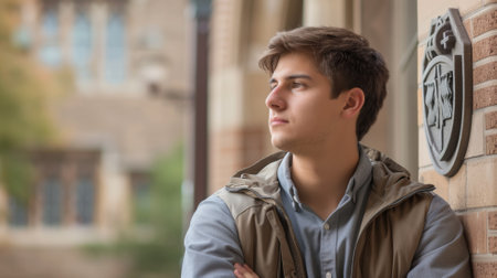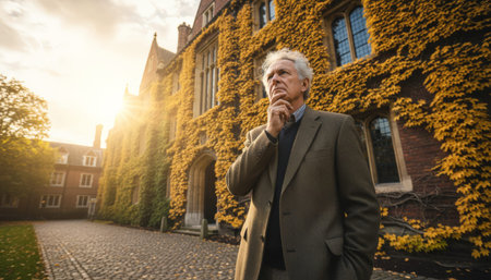 Elderly Man Outside Ivy Covered College, Thoughtful Retired Professor Pausing On Cobbled Walkway, Historic Brick Facade Draped In Autumn Foliage, Warm Golden Sunlight Casting Long Shadows,
