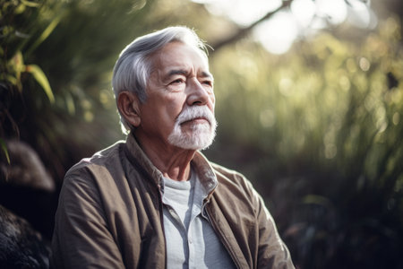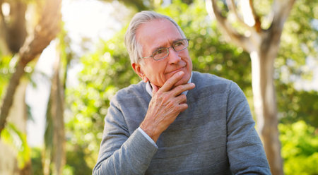shot of a senior man looking thoughtful while sitting outside, created with generative ai