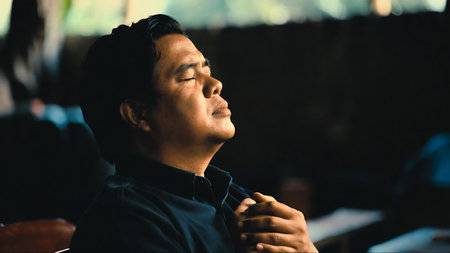 Conceptual and emotive image of man in deep thought or prayer. His hands are clasped and head is bowed, while brilliant, ethereal golden light emanates from behind him. This powerful and spiritual composition symbolizes faith, hope, inner reflection.