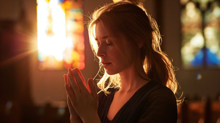 Female figure with curly hair, eyes closed in meditation, surrounded by soft light from stained glass windows, evoking a peaceful and reflective moment
