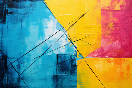 Bright and vibrant abstract composition featuring diagonal blocks of pink, yellow, blue, and green, creating a modern geometric design.