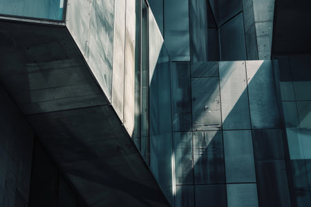 Abstract architectural detail featuring geometric panels, strong light and shadow contrast, and textured cladding in cool, desaturated blue and gray tones.