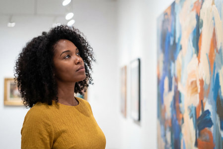 Contemplative african american woman with curly hair stands in modern museum and gazes intently at colorful abstract painting displayed on white gallery wall.