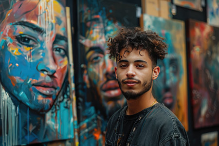 A young man with curly hair stands confidently in front of a colorful urban art display, his casual style complementing the bold portraits behind him.