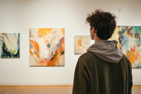 A young man observes colorful abstract artwork in a modern gallery, representing culture, appreciation, and creativity.