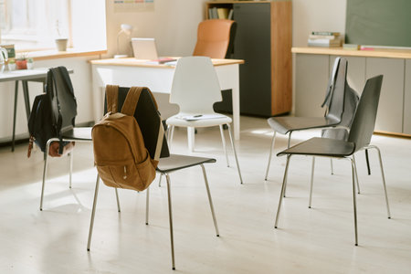 morning sunshine on desks and chairs in empty classroom - waiting for students to come in