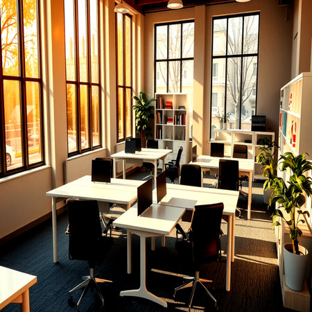 Side view of clean classroom interior with desks, blurry city view and daylight. 3D Rendering