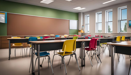 An empty classroom with colorful desks and chairs, a whiteboard and windows on the side, making it perfect for education and learning.