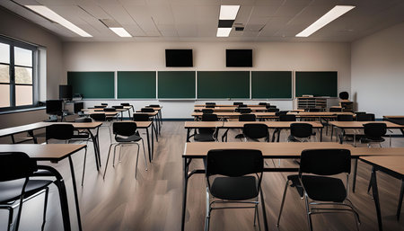 Empty school classroom interior with desks and chairs, empty space for text on chalkboard. Contemporary schoolroom with comfortable furniture