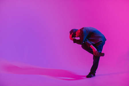 Cool young breakdancer dancing hip-hop in neon studio light, standing on hand. Dance school advertising. Long exposure