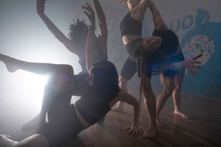 In the frame on a black background. Dancing collective, a team consisting of young, attractive girls. They demonstrate various dance moves in the direction of jazz funk.