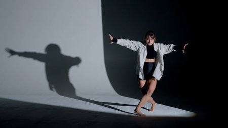 Young woman wearing a top, shorts and a shirt performing contemporary dance under a spotlight in the studio. Contrasting black falling shadow on the background. Full length.