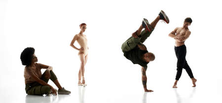 Set of artistic young people, men and women dancing contemporary dance styles, hip hop against multicolored background in neon light