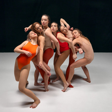 Group of young beautiful flexible girls in bodysuits performing, dancing contempt over black studio background. Concept of hobby, art, dance