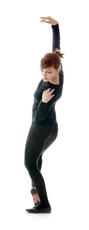 Young woman in black clothes dancing contemporary on white background