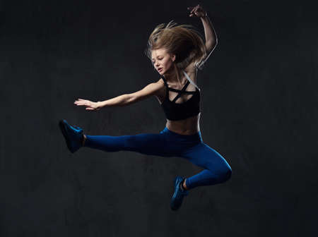 Young blonde ballerina in sportswear dances and jumps in a studio. Isolated on a dark background.