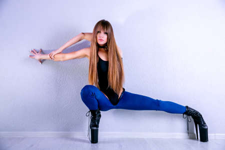 Beautiful flexible girl pole dancer in high heels posing in studio