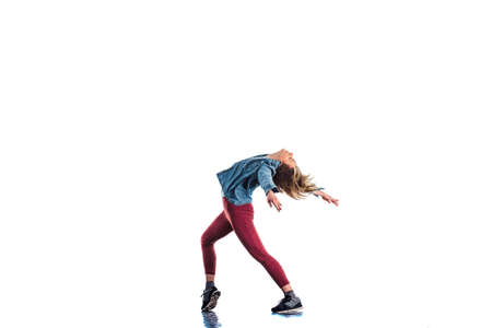 Modern dance performance by young girl. Young beautiful dancer posing on studio background.