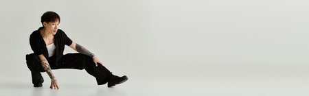 A young handsome asian man showcases his stylish outfit while striking a unique pose indoors.