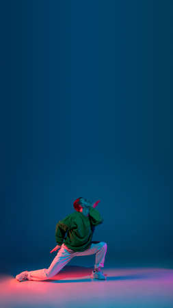 Flyer. Stylish sportive boy dancing hip-hop in stylish clothes on colorful background at dance hall in neon light. Youth culture, movement, style and fashion, action. Fashionable bright portrait.