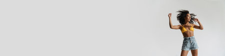 Black woman in swimsuit smiling and dancing on camera isolated over white background