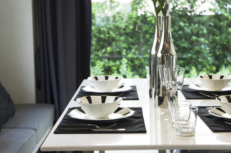 modern dining room with table set for dining, interior design concept