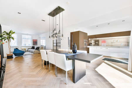 Modern minimalist style interior design of studio apartment with open white kitchen and dining zone with table and chairs illuminated by loft style lamp