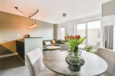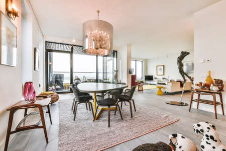 Table with chairs room with stylish decorations in modern apartment