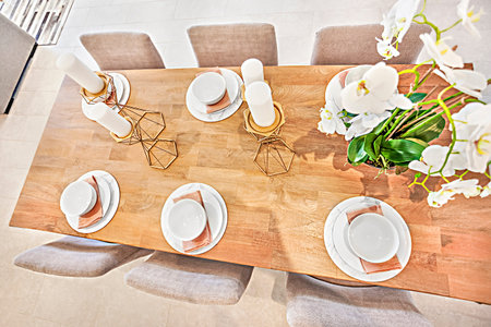 High angle view of wooden and cozy house with vintage interior style. Celebration table setting with wine glass, plates, elegant tableware and white orchid flower