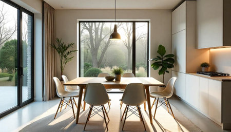 Bright modern dining room with nature view through window