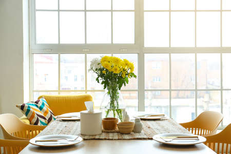 Dining table with setting and vase served for International Women's Day celebration in light kitchen
