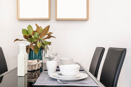 glass dining table with table set in modern dining room interior design concept