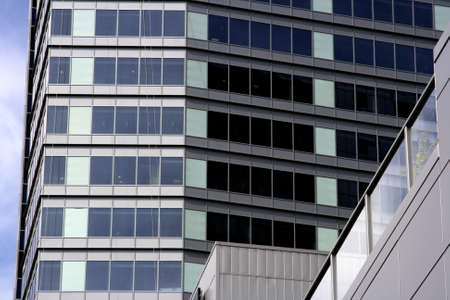 details of the facade of a modern skyscraper made of glass and steel closeup
