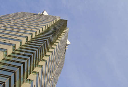 High and glassy office building, from the worm eyes view, showing an interesting reflection
