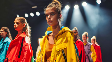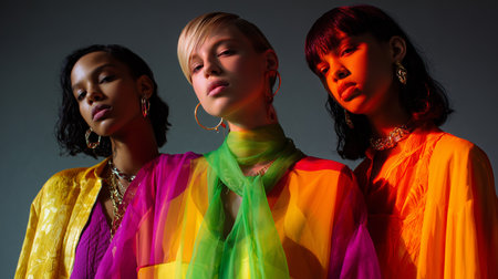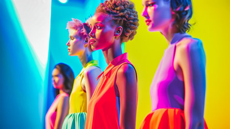 Fashion models showcase vibrant outfits in a studio setting with colorful lighting