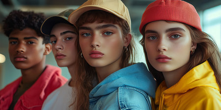 A diverse group of teenagers standing against a vibrant, multicolored background, expressing unity and youth. Perfect for concepts related to friendship, diversity, and modern fashion.
