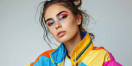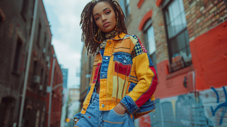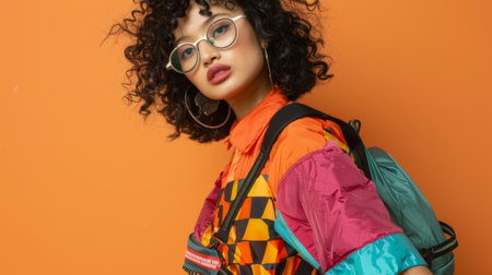 Stylish Young Woman in Trendy Streetwear Against Vibrant Background