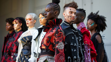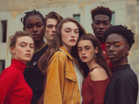 Diverse fashion group posing confidently in city setting. AI-generated.