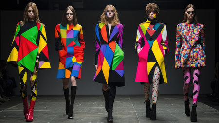 A vibrant geometric fashion collection displayed on a runway, showcasing bold patterns and colors.