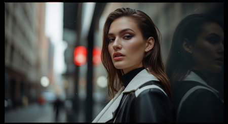 A stylish woman with long hair, wearing a black and white jacket, standing in a city street with blurred urban background