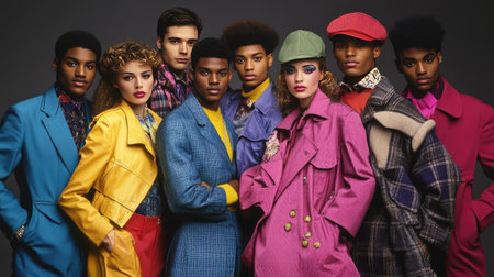 A group of young fashion models posing together in vibrant, trendy outfits, capturing the spirit of unity and diversity in the fashion industry. Generative Ai
